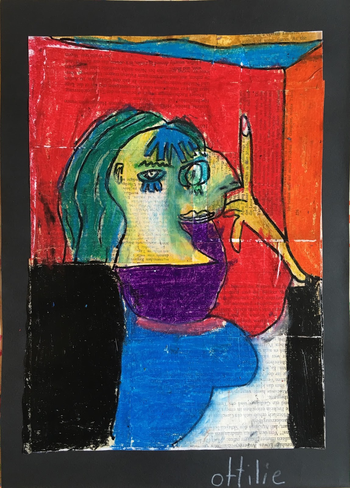 So, we each chose a Picasso women and set out to draw her exactly the we observed her, using oil pastel on collage paper.